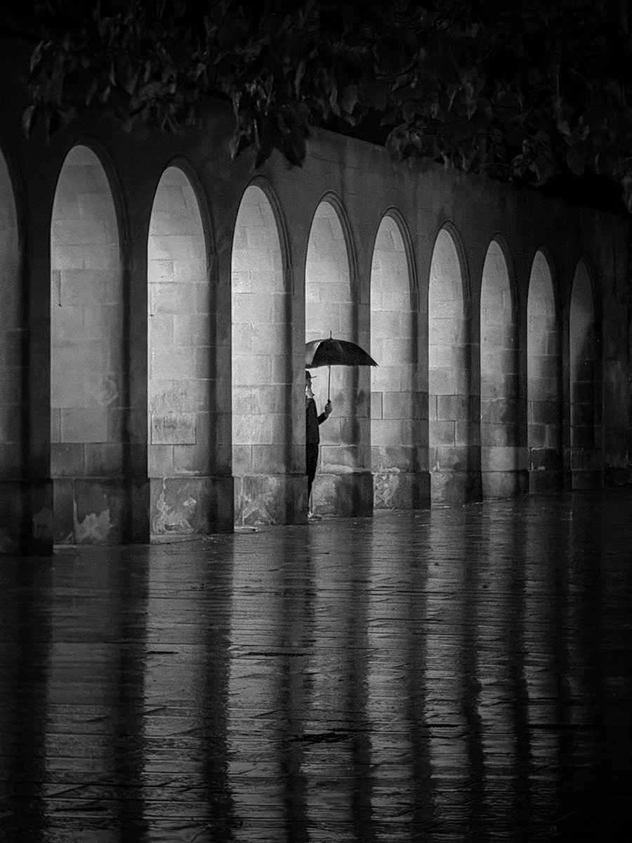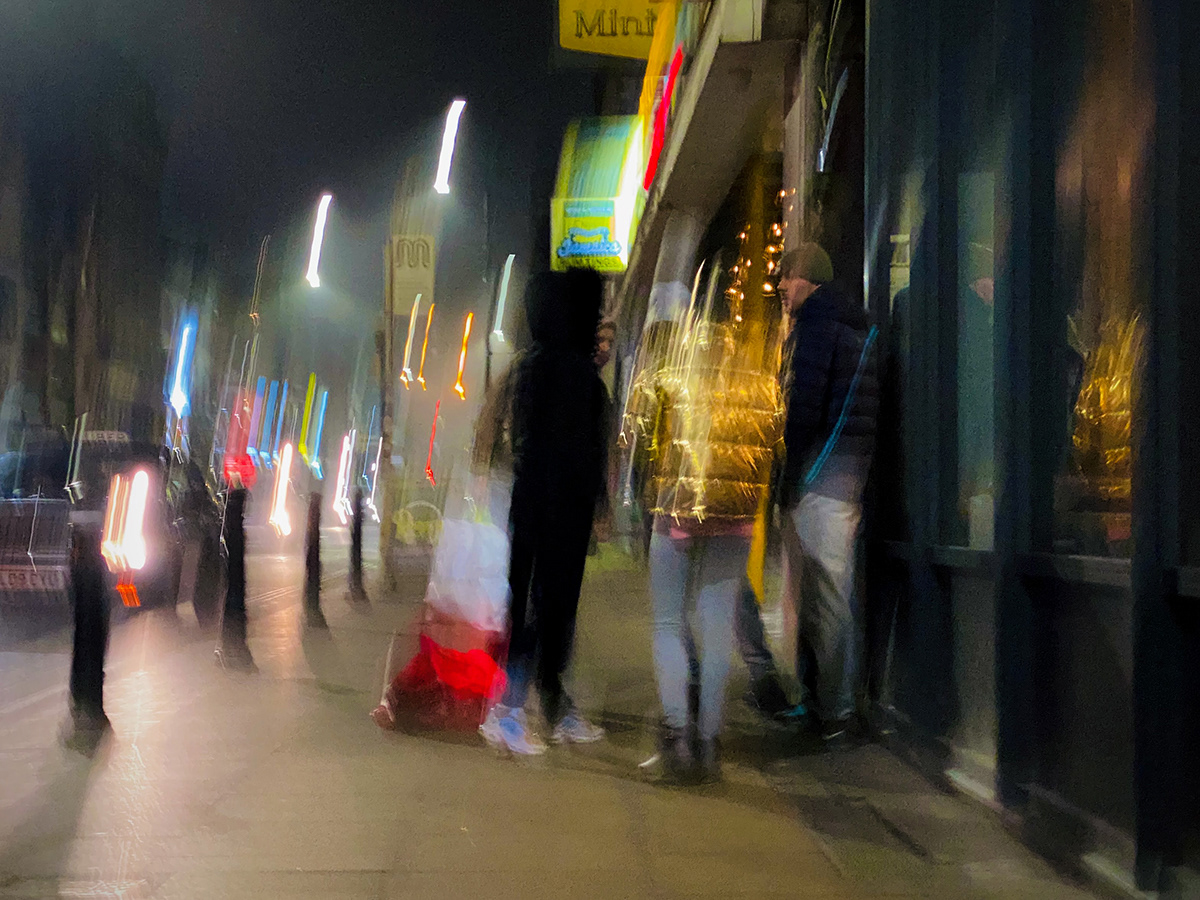 People drift through the frames but they’re rarely the point. They’re part of the rhythm. A figure passing a wall. Someone waiting. Someone moving on. The city stays put while everything else changes around it.