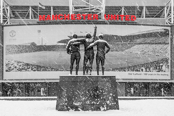 A winter moment at Old Trafford, Mabchester captured as snow falls across the Trinity Statue of Law, Best and Charlton, silhouetted against the stadium mural celebrating 100 years of Old Trafford in 2010.